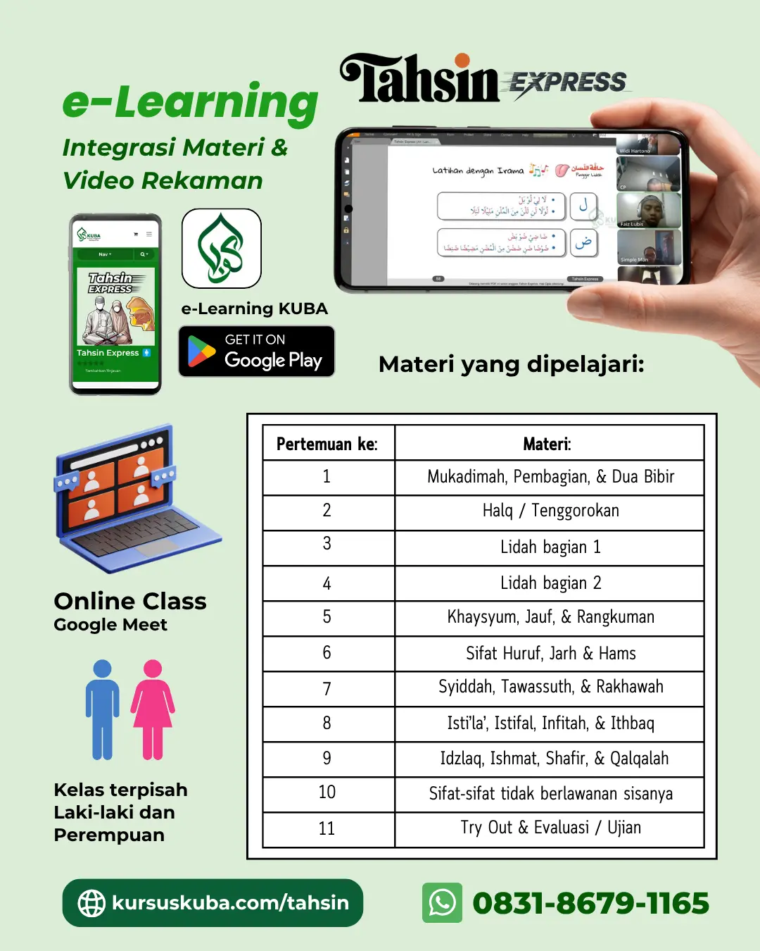 Kursus cepat Tahsin tilawah al-Quran secara Online & Offline untuk dewasa maupun anak-anak. Sejak 2022, sudah ada ratusan murid dari berbagai penjuru Indonesia belajar bersama kami, Alhamdulillah.